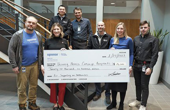 Recipients of the Uponor North America Unsung Heroes donations gathered in Apple Valley, Minn., to be honored with their donations. From L-R: Alex Khrystych, Sarah Qualy, David Nguyen, Yakov Gradinar, Nate Martineau, Aubrey Mozer, and Yury Aroshidze.