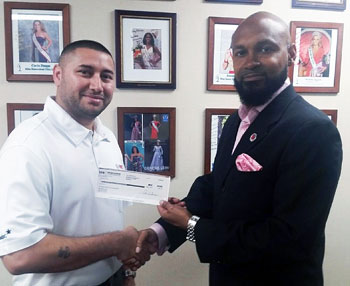 Saul Flores (l.) of Marcone Supply presents a check for $1,083 to VA representative Mernie Williams of the Miami