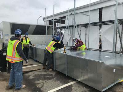 Weickert Industries installing ductwork in triage tent.