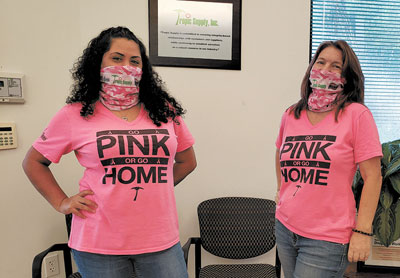 Jessica Esmurria and Jennifer Conception of Tropic Supply rocking their cancer awareness month camo neck buffs and t-shirts.