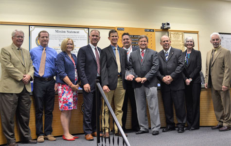 Danfoss recognized Escambia County School District (ECSD) as one of its 2018 EnVisioneer of the Year award winners. Pictured are: Danny Agnew, vice president, Lanico, Inc. (2nd from left); John Galyen, president, Danfoss North America (4th from left); Roger McGraw, mechanical engineer, ECSD Facility Planning (5th from left); and Victor Smith, regional sales manager, Danfoss (5th from right); with members of the ECSD school board.