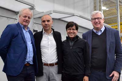 Left to right: Celebrating the delivery and signing of the first manufactured StatePoint™ Liquid Cooling (SPLC) system, “The World’s First Sustainable Data Center Cooling Technology” (pictured in background) on Dec. 3 is Simon Peckham, Chief Executive, Melrose Industries PLC, London,—parent company of Nortek Air Solutions (NAS), St. Louis; Bruno Biasiotta, CEO, NAS; Kris Holla, Group Vice President-Channel Sales, NAS; Kevin Facinelli, Senior Vice President-Engineering NAS. The delivery celebration took place at Nortek Air Solutions’ Oklahoma City, Okla., SPLC factory.