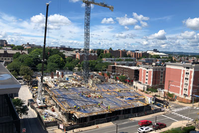 Construction site at the new HERE at State College student residential and retail complex in State College, Pennsylvania.