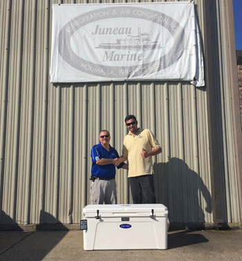 Bobby Root congragulates Ladd Straatmann of Juneau Marine, winner of the Yeti cooler in the CE Mid-South ductless promotion.