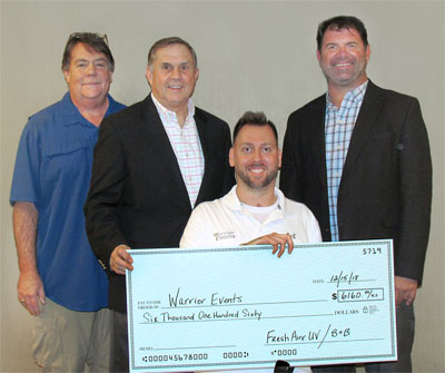 (Photo courtesy of Jennifer Queen, B&B Air Conditioning & Heating Service) (right to left) Ron Saunders, vice president of HVAC indoor air quality manufacturer, Fresh-Aire UV, Jupiter, Fla.; presented a check to injured veteran Adam Keys, a former U.S. Army paratrooper that lost three limbs in Afghanistan in 2010, via Robert Saunders, president of the veterans charity, Warrior Events, Annapolis, Md.; and Bill Williams, executive vice president at HVAC contractor, B&B Air Conditioning & Heating Service Co., Rockville, Md.