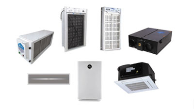 Top row (L-R) – Air Duct Sterilizing Purifier, Air Sterilizing Purifier for Air Handling Unit, Return Air Sterilizing Purifier for Fan Coil Unit, and Fresh Air Sterilizing Purifier; Bottom row (L-R) – Ceiling Central Air Sterilizing Purifier, Portable Air Sterilizing Purifier, and Ceiling Mounted Air Sterilizing Purifier (Stand Alone)