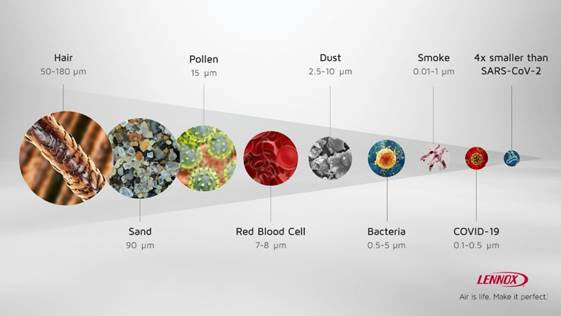 Lennox’ residential air filtration systems remove over 99% of virus particles, including the common cold, influenza and viruses 4x smaller than SARS-CoV-2. It is even more efficient – 99.9% to be precise – at removing larger particles, like mold spores, pollen, dust and pet dander.