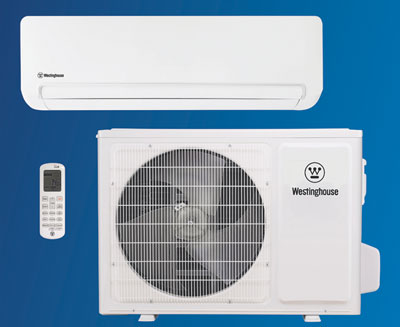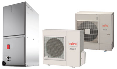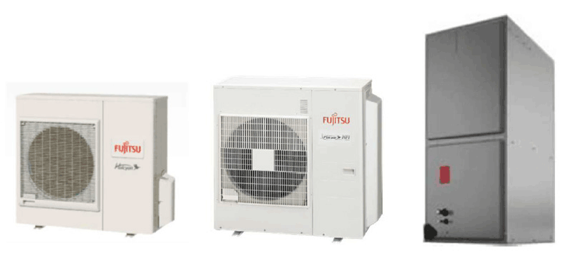From left to right: 2- and 2.5-ton capacity side-blowing compact outdoor unit with a single fan; 3- and 4-ton capacity outdoor unit of the same configuration; and a 3- and 4-ton capacity multi-positional air-handling indoor unit.
