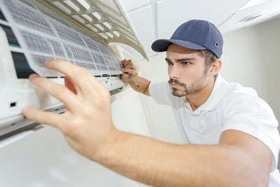 Photo of technician servicing a ductless mini-split HVAC unit
