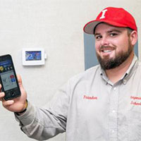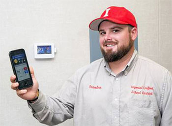 Brandon Machado uses his mobile phone to remotely control ColorTouch thermostats across the district.
