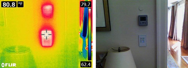 Thermal imaging showed that the thermostat was reading the correct temperature radiated by a light switch below.
